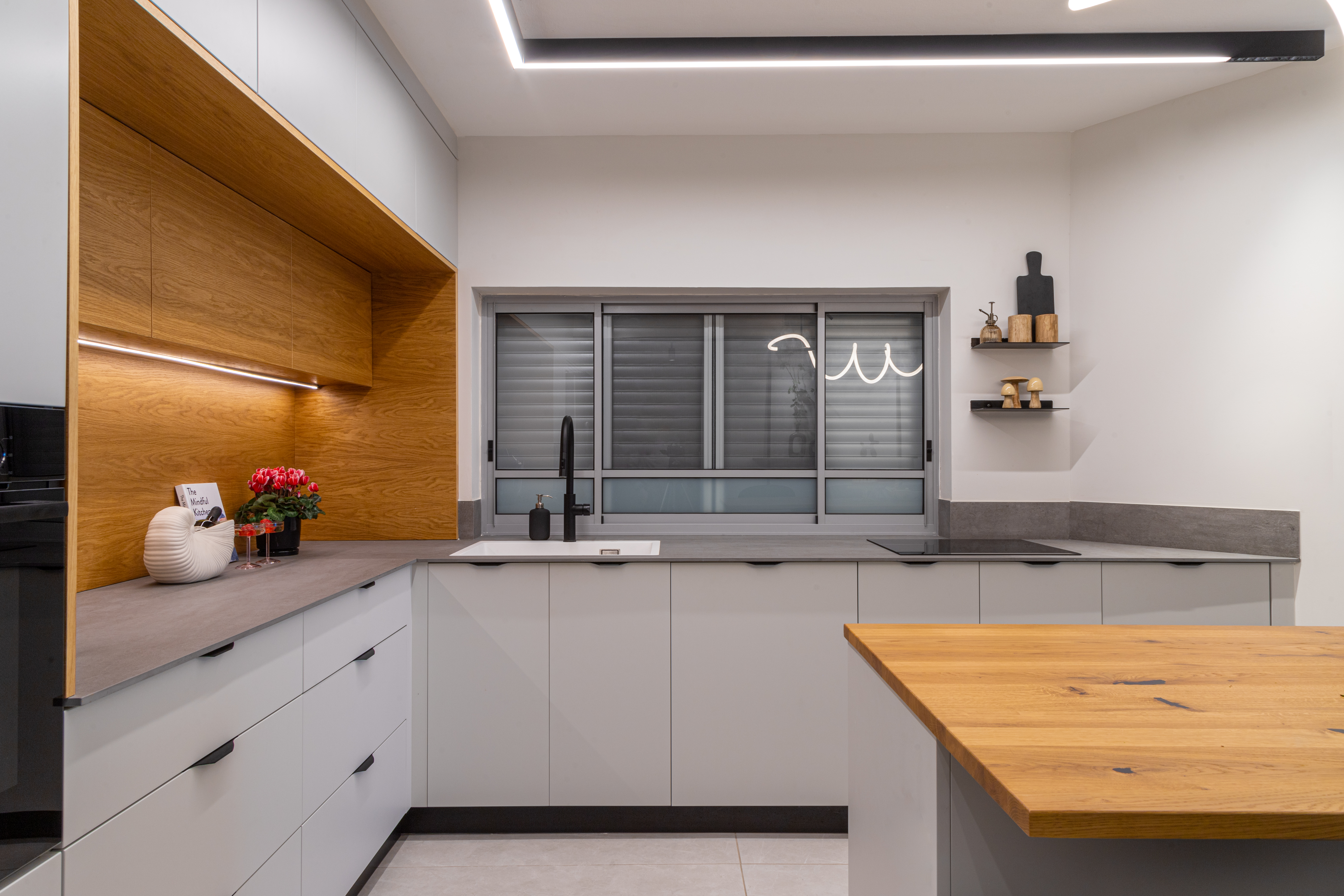 בתכנון הושם דגש על מטבח מרווח ומאובזר, עם פתרונות אכסון חכמים, חדרים מרווחים, וחדר כביסה נוח לתפעול יומיומי. בכל חלל נעשה שימוש בחומרים טבעיים, עם שילוב של עץ בגווני תכלת ונגיעות שחורות שיוצרות קונטרסט מעניין ואלגנטי.