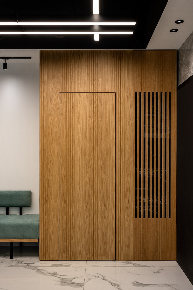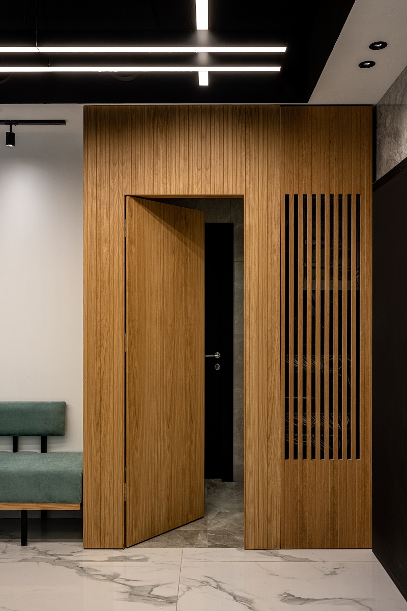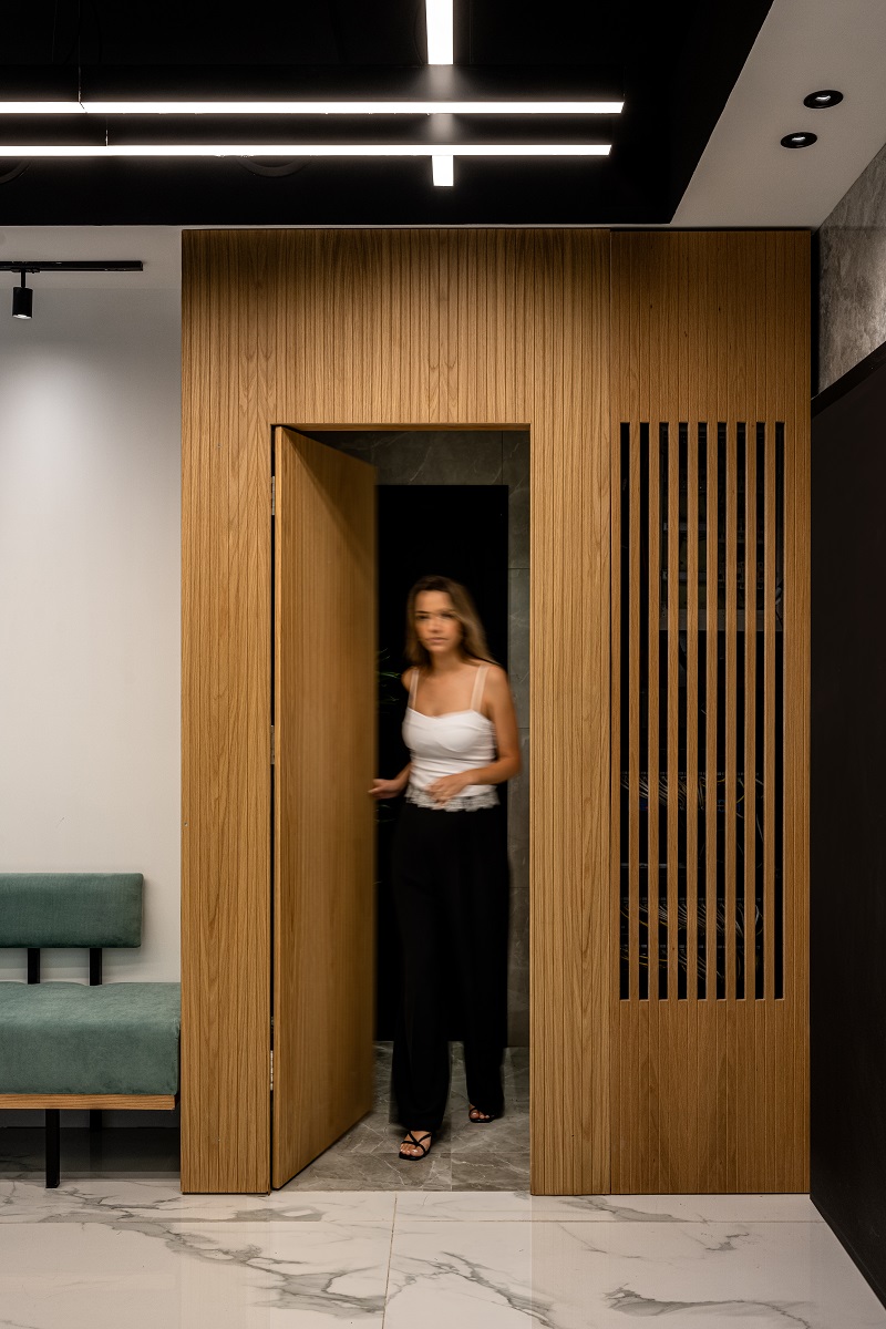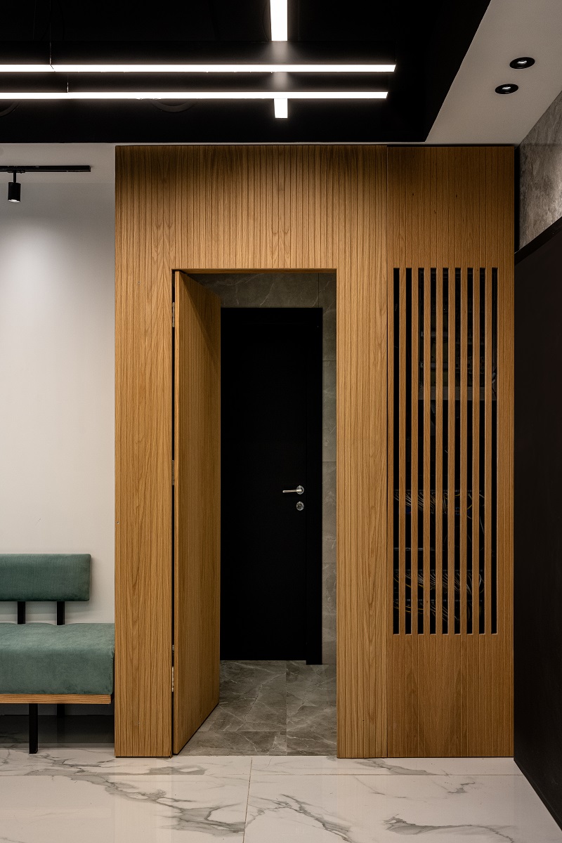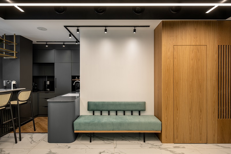 מבחינה עיצובית נבחרו גוונים דרמטיים של שחור ולבן, שמאזנים בחמימות עם חיפוי עץ, היוצר תחושת רוגע ונעימות.