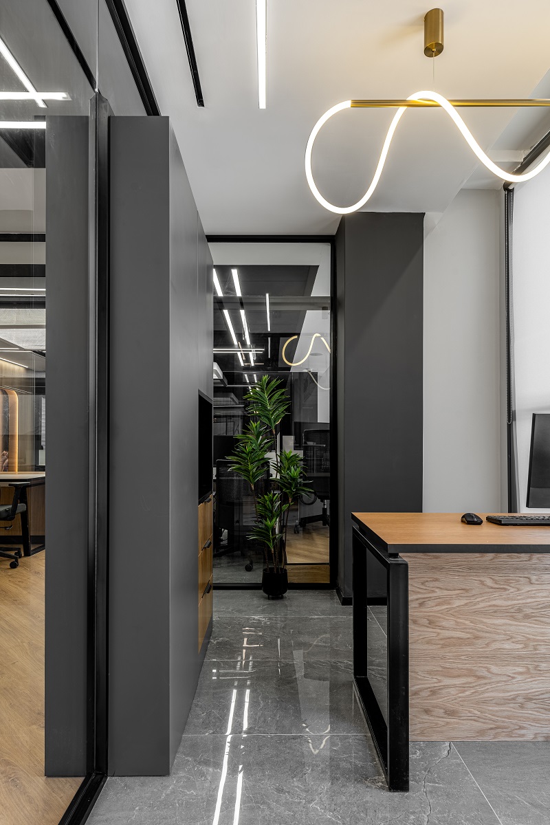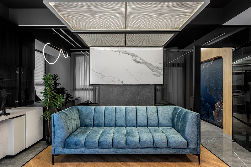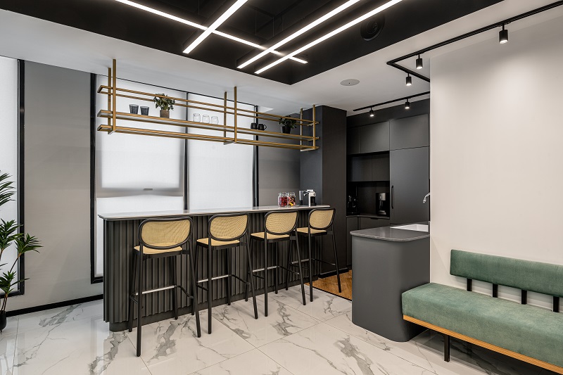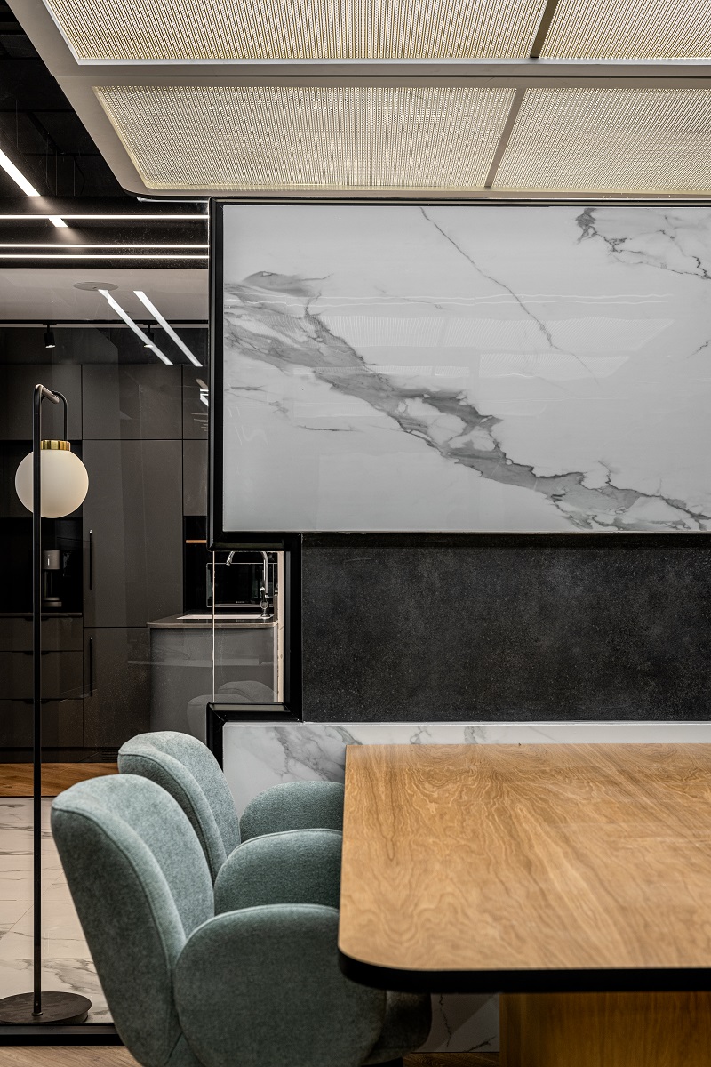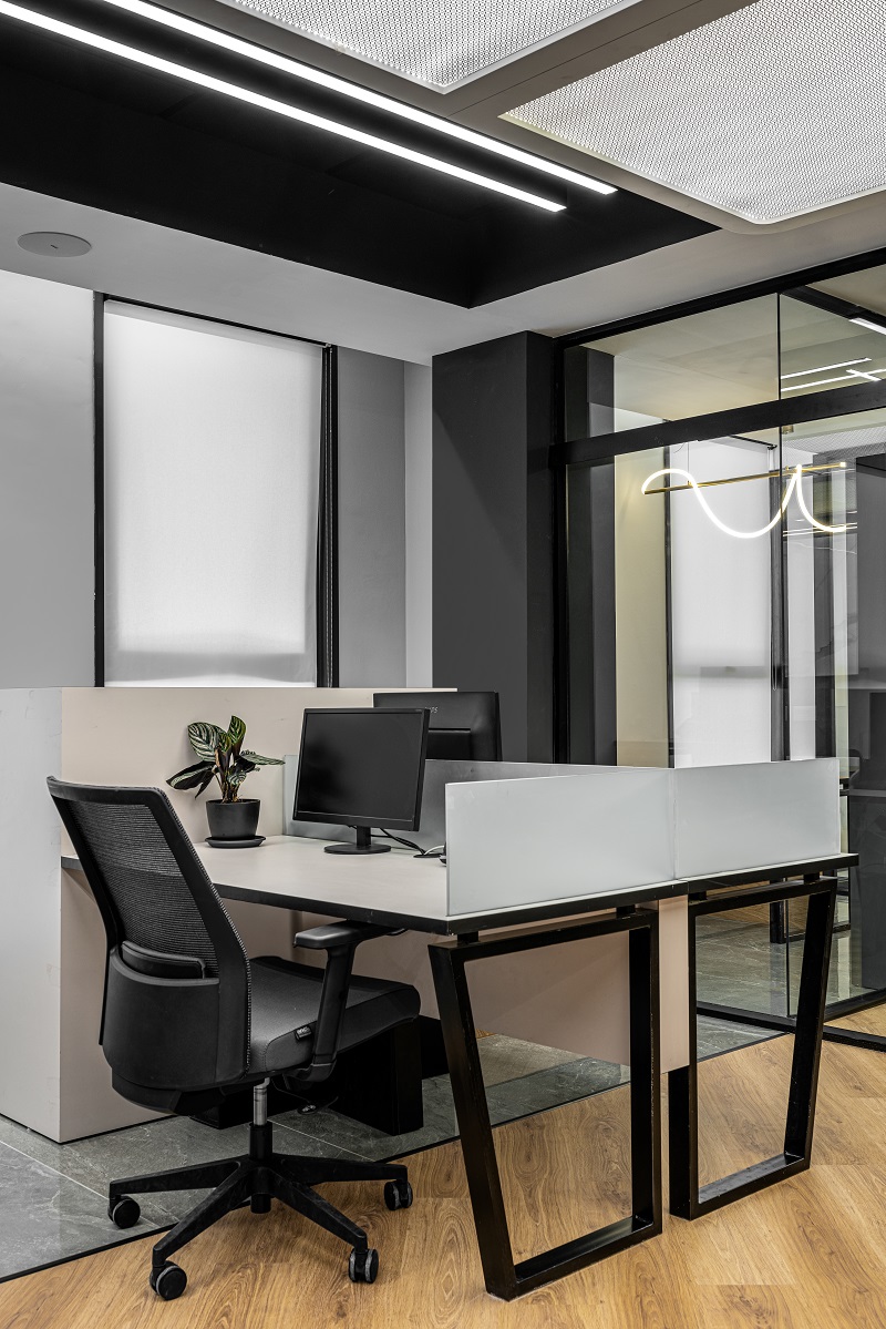 מבחינה עיצובית נבחרו גוונים דרמטיים של שחור ולבן, שמאזנים בחמימות עם חיפוי עץ, היוצר תחושת רוגע ונעימות.