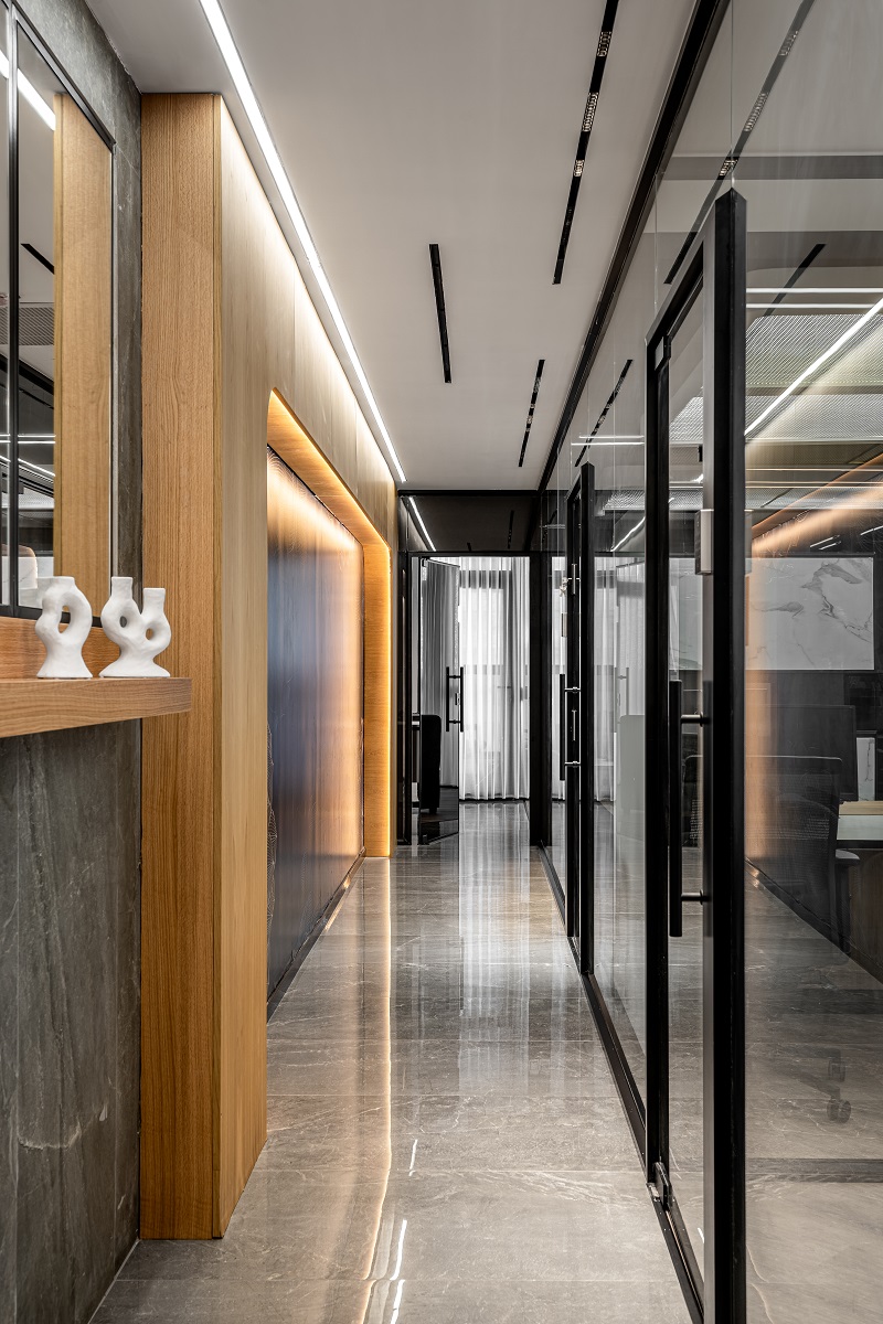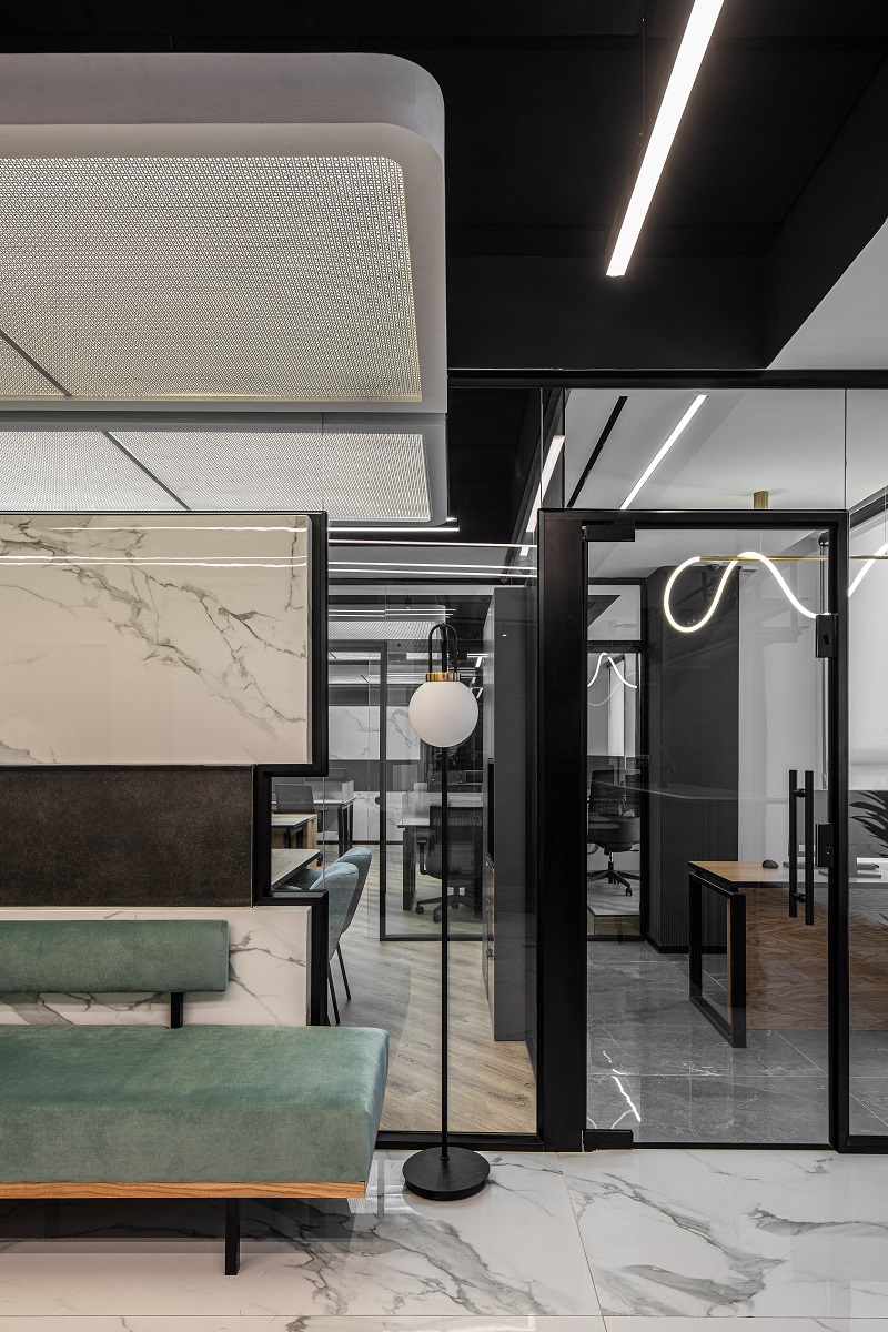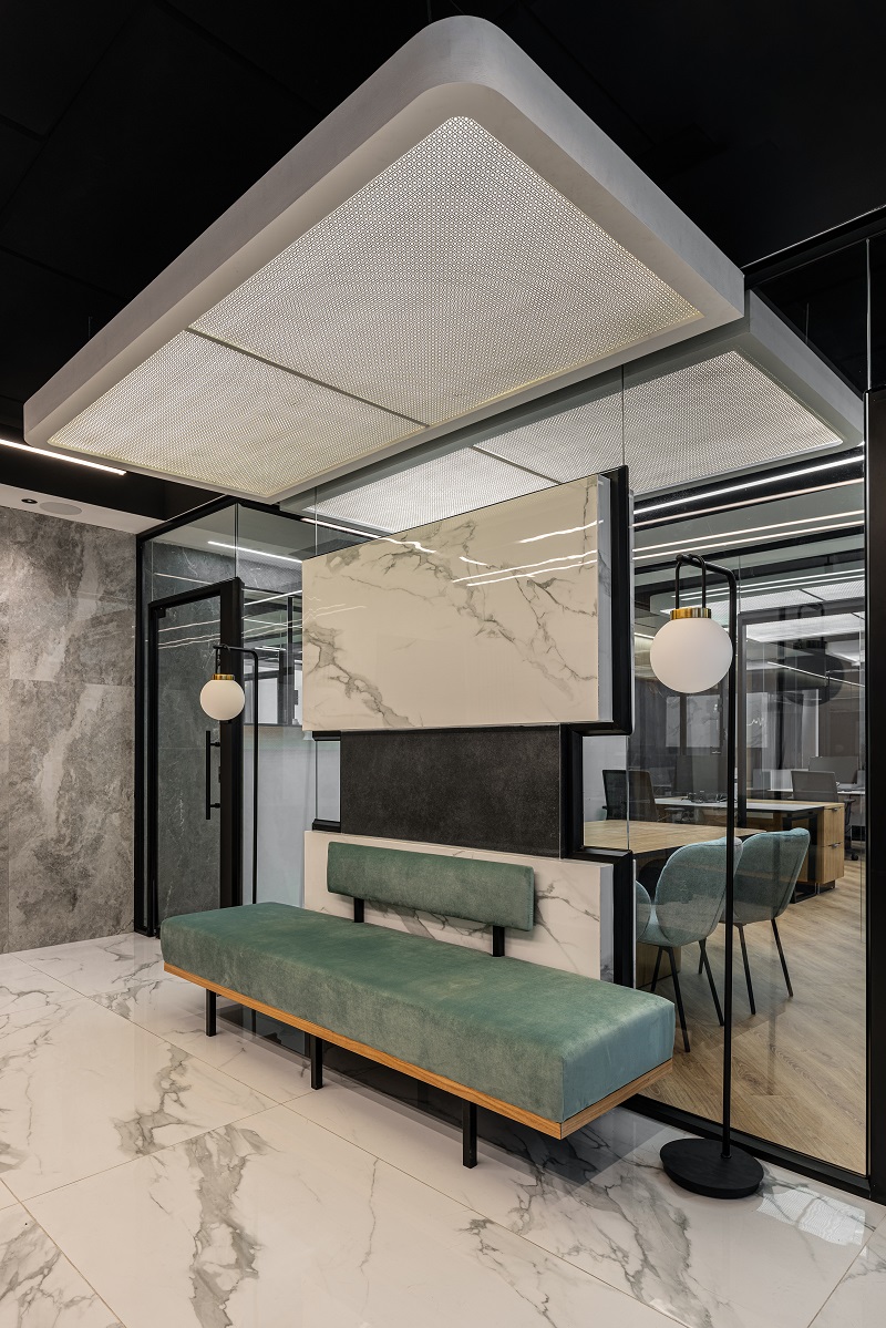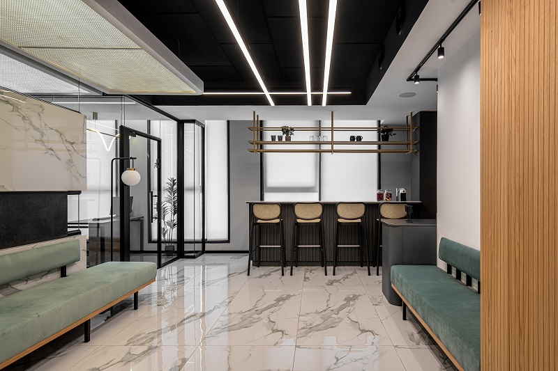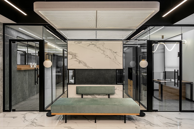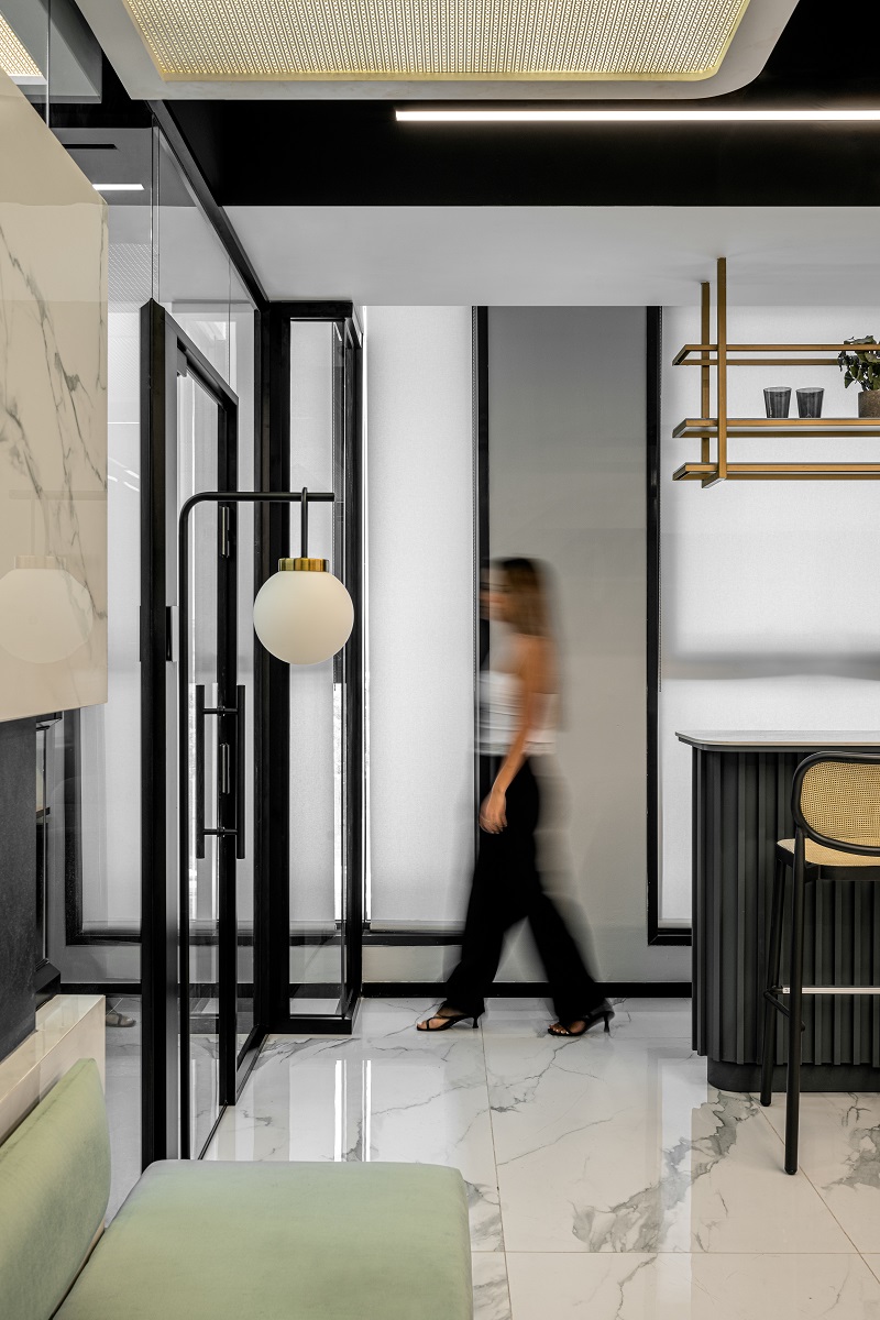 כשנכנסים פנימה, דרך חזית ארוכה שמחולקת בזכוכיות וקירות גבס מחופים בגרניט פורצלן, ניתן לחוש את הזרימה והקישור בין החללים השונים.