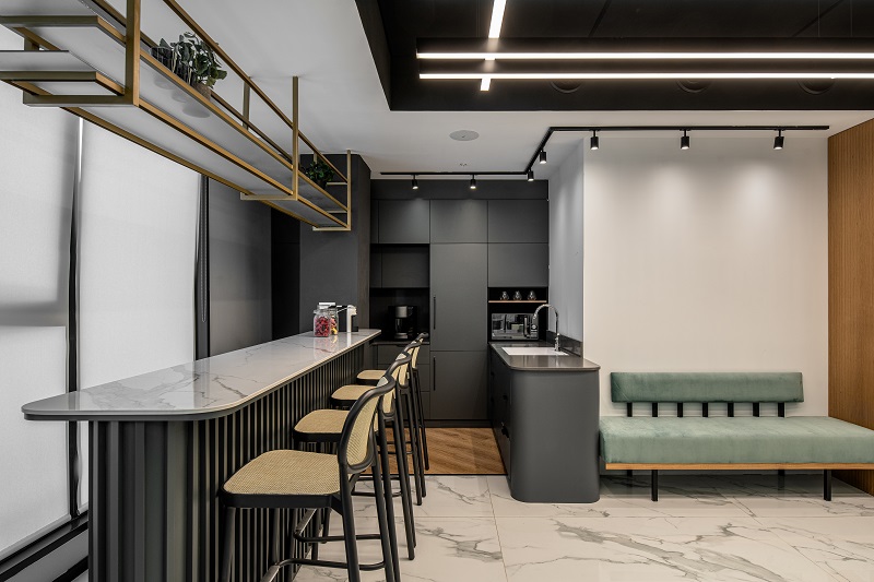 בחלוקת החלל הושם דגש על יצירת כניסה מרווחת עם אווירה מזמינה ואירוחית, הכוללת בר וספסלי ישיבה שמזכירים בית קפה קליל.