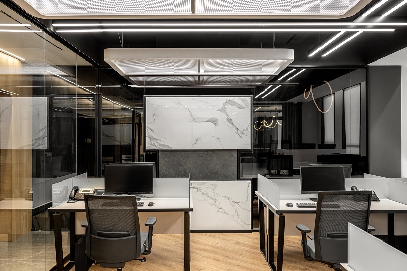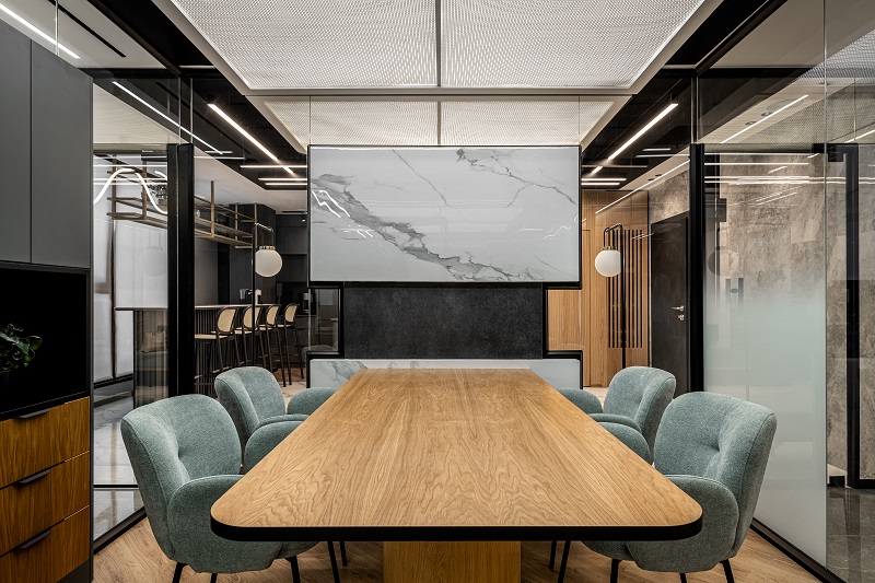 בתקרה הושקעה מחשבה בתכנון מערכות מיזוג ושמירה על אקוסטיקה באמצעות חיפויי תקרה אקוסטיים.