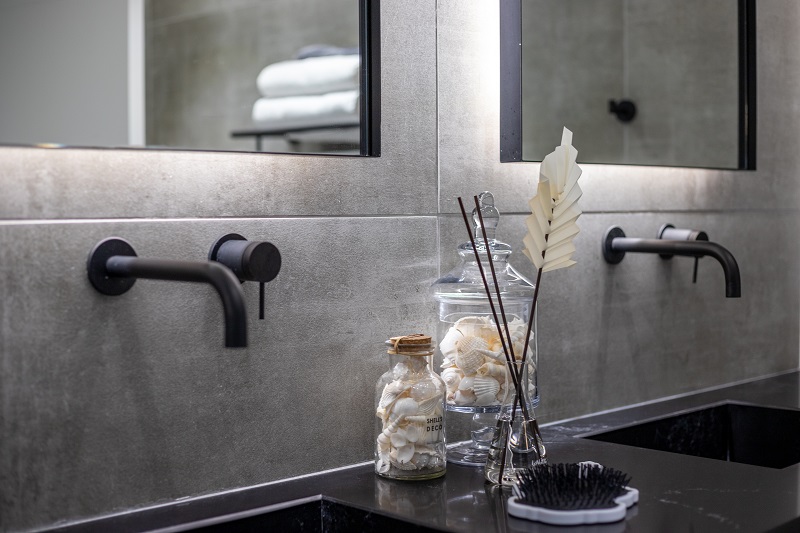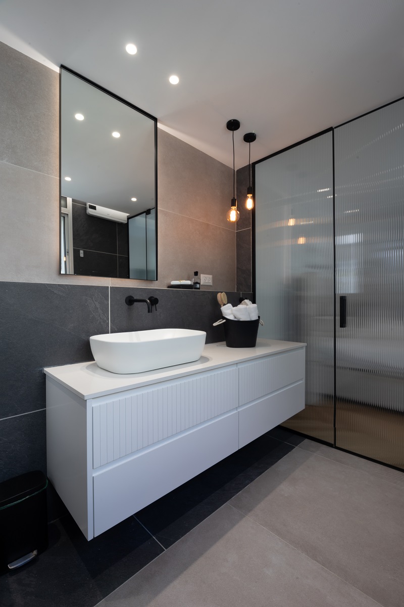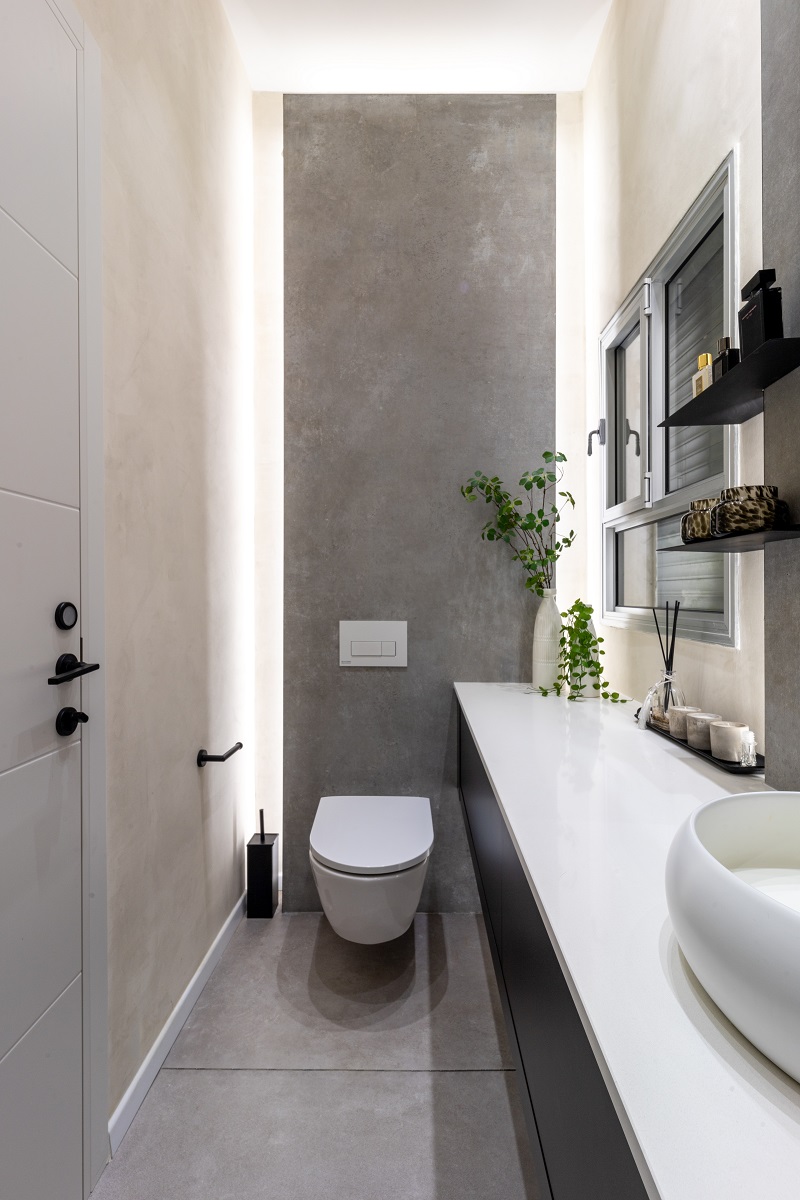 העיצוב בחדר הרחצה משלב בין מינימליזם לנגיעות של חמימות ואופי.